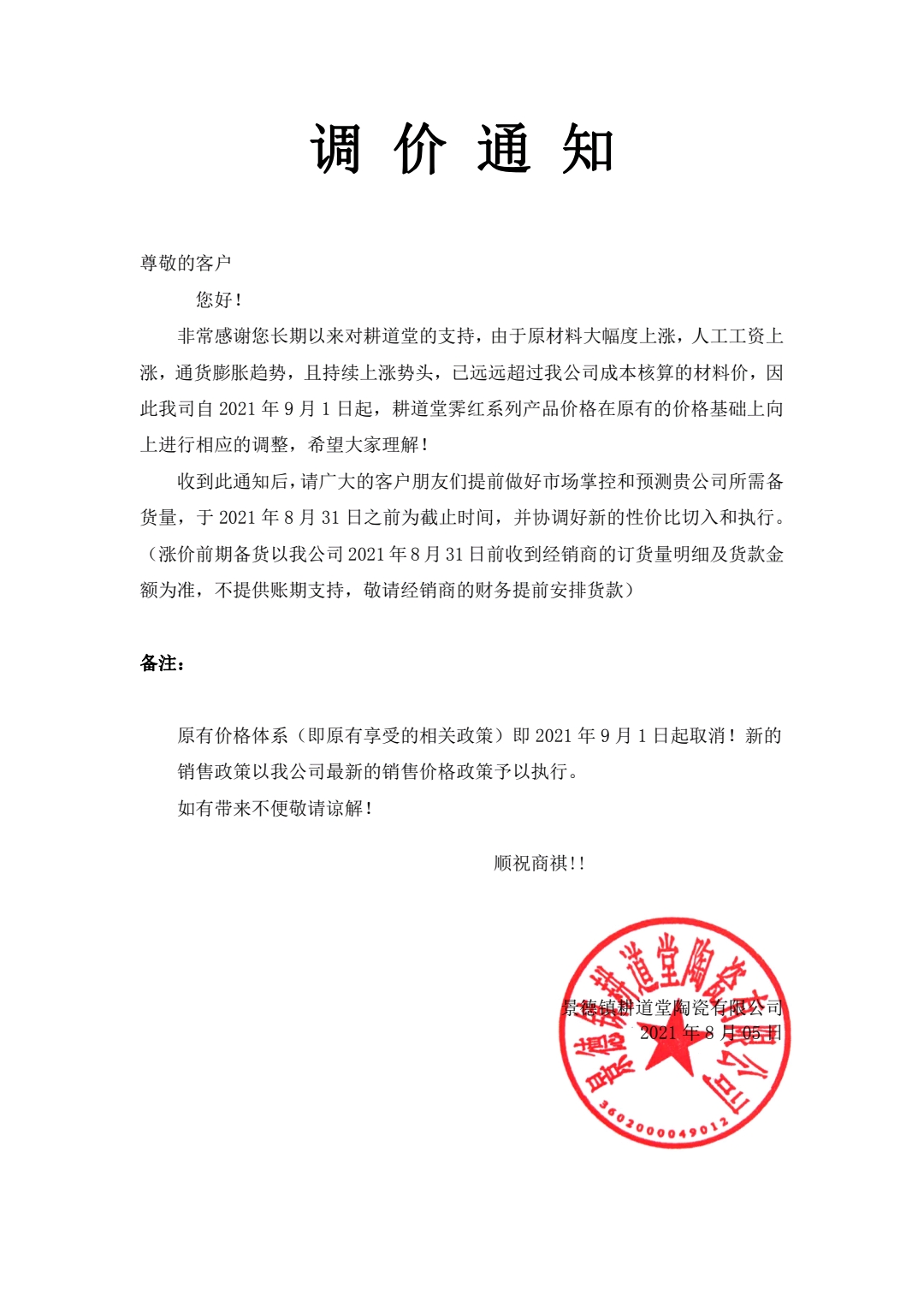 關(guān)于耕道堂霽紅描金產(chǎn)品調(diào)價公告